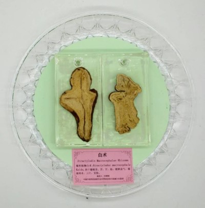 该图展示的是不同产地白术饮片标本白术(片)安徽菊科植物白术AtractylodesmacrocephalaKoidz.的...