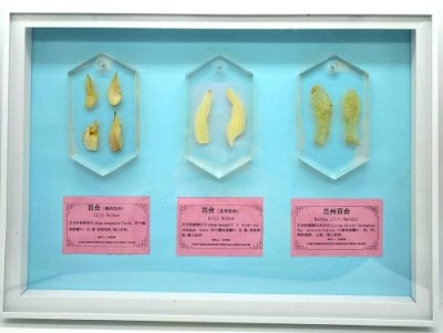 该图是一组来源不同的百合标本:龙牙百合、卷丹百合、兰州百合百合(龙牙)湖南百合科植物百合Li...